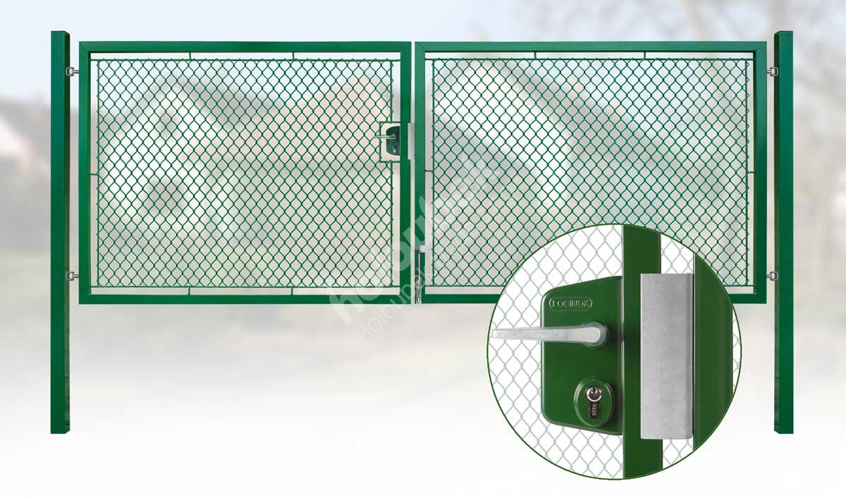 Vypletená čtyřhranným poplastovaným pletivem. Za výplet pozinkovaným pletivem příplatek 15%. Součástí brány jsou 2 ks nosných sloupů 80x80x3 mm.